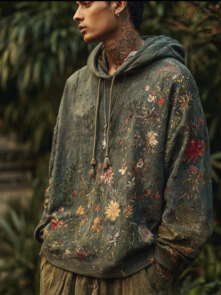 Bohemian Style Plant And Flower Pattern Men's Hooded Sweatshirt