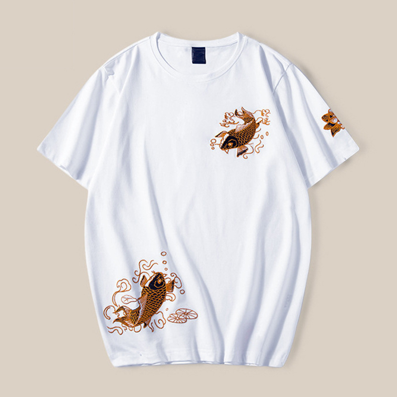 Japanese Koi Carp Embroidery Cotton Crew Neck T-shirt