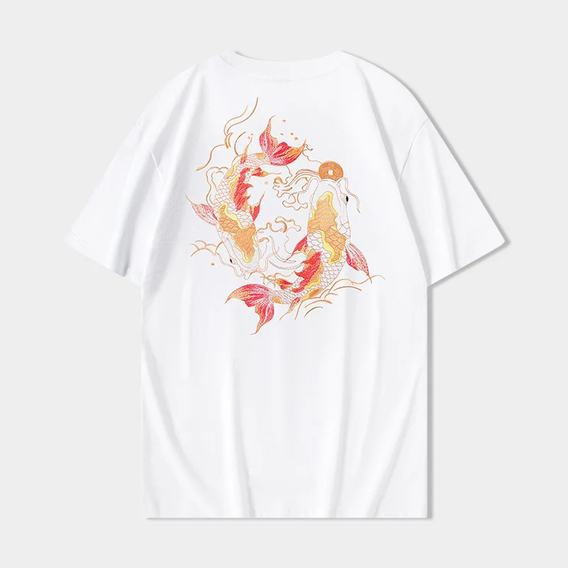 Koi Embroidery Round Neck Short-sleeved Cotton T-shirt