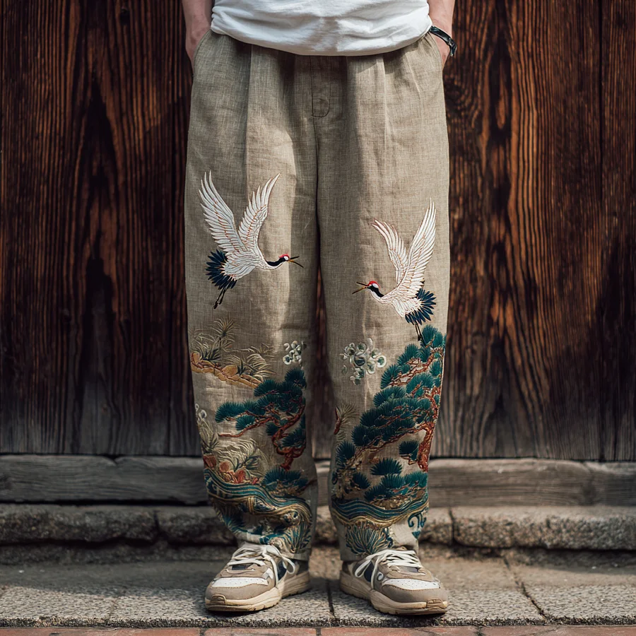 Men's Japanese Pine Crane Embroidery Art Linen Blend Pants