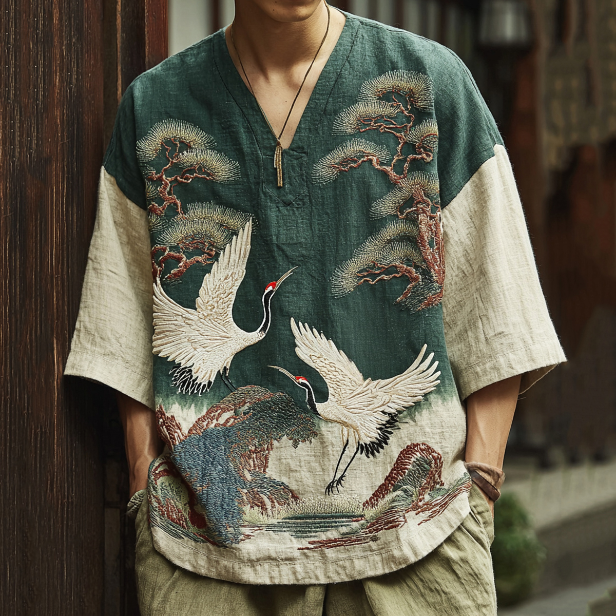 Men's Japanese Pine Crane Embroidery Art V-neck Linen Blend T-shirt