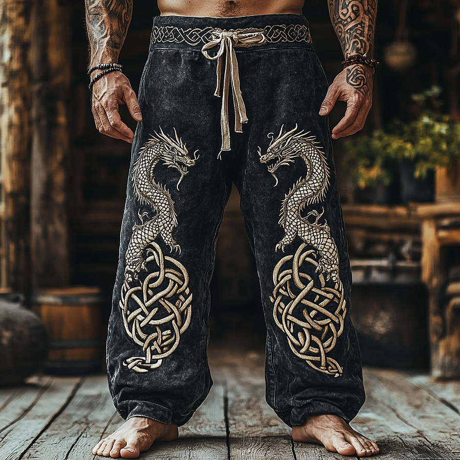 Men's Retro Viking Tribal Dragon Celtic Knot Art Linen Pants