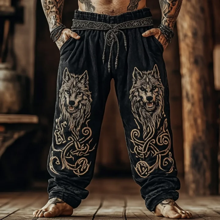 Men's Viking Celtic Knot Wolf Linen Blend Wide Leg Pants