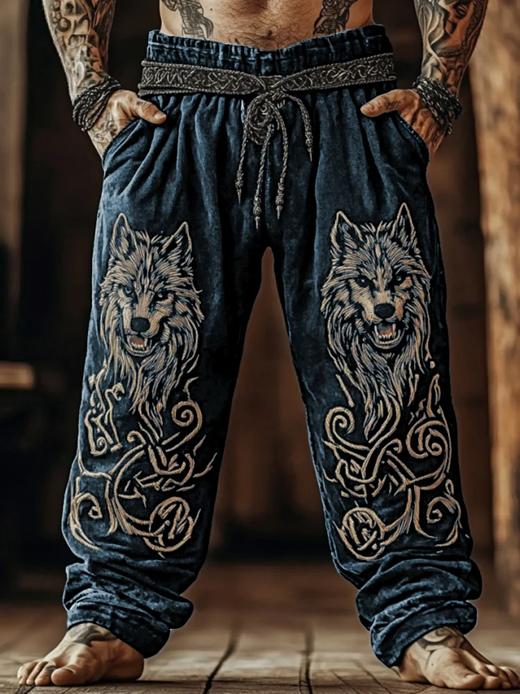 Men's Viking Celtic Knot Wolf Linen Blend Wide Leg Pants