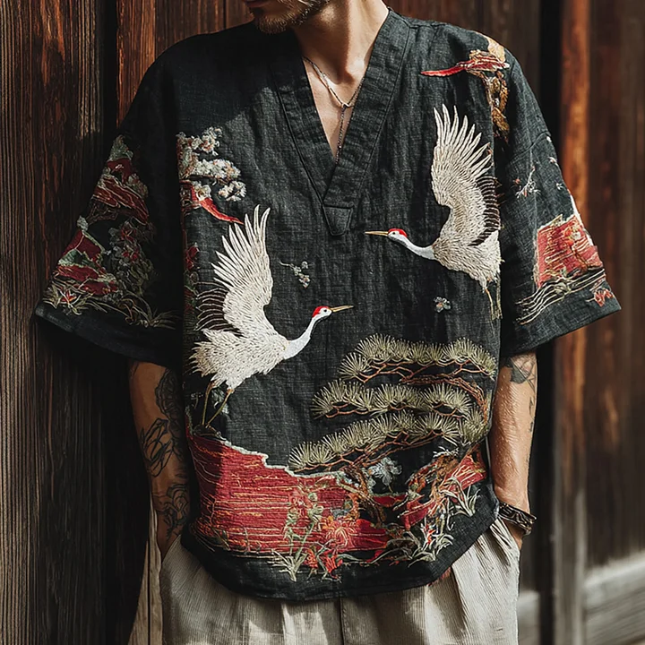 Men's Vintage Japanese Art Pine Crane Embroidery V-neck Linen Blend T-shirt