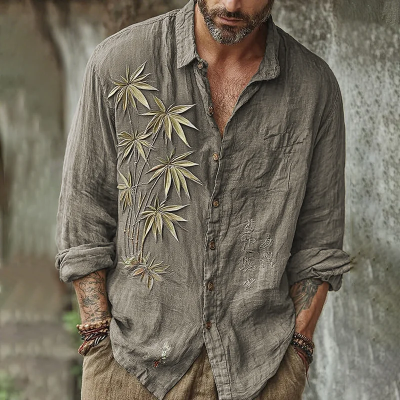 Men's Vintage Japanese Bamboo Embroidery Art Long Sleeve Linen Blend Shirt