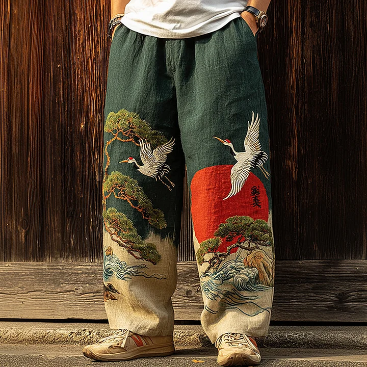 Men's Vintage Japanese Pine Crane Embroidery Art Casual Linen Blend Pants