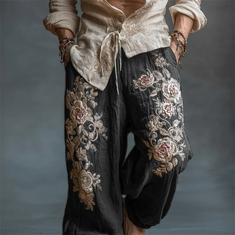 Men's Vintage Roses Embroidered Drawstring Wide Leg Linen Pants