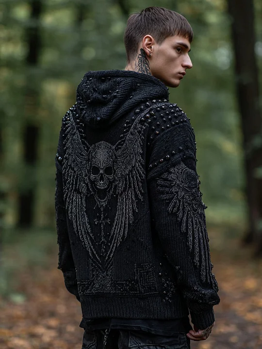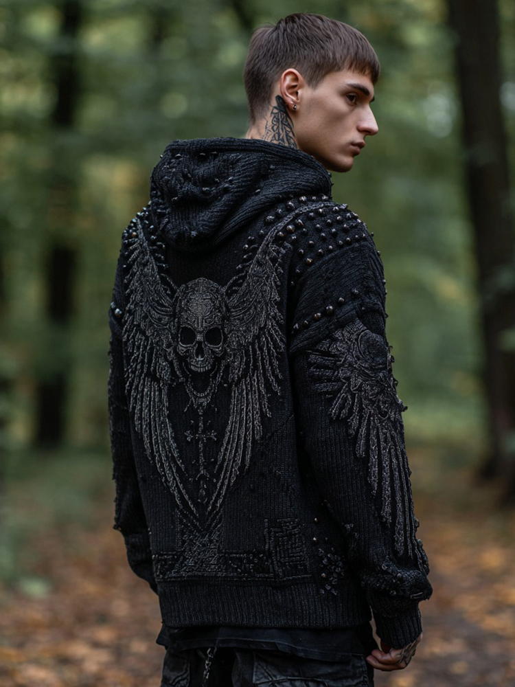 Men's Viking Tribal Jacquard Celtic With Rose And Skull Face Inspired Chunky Knit Hooded Sweater