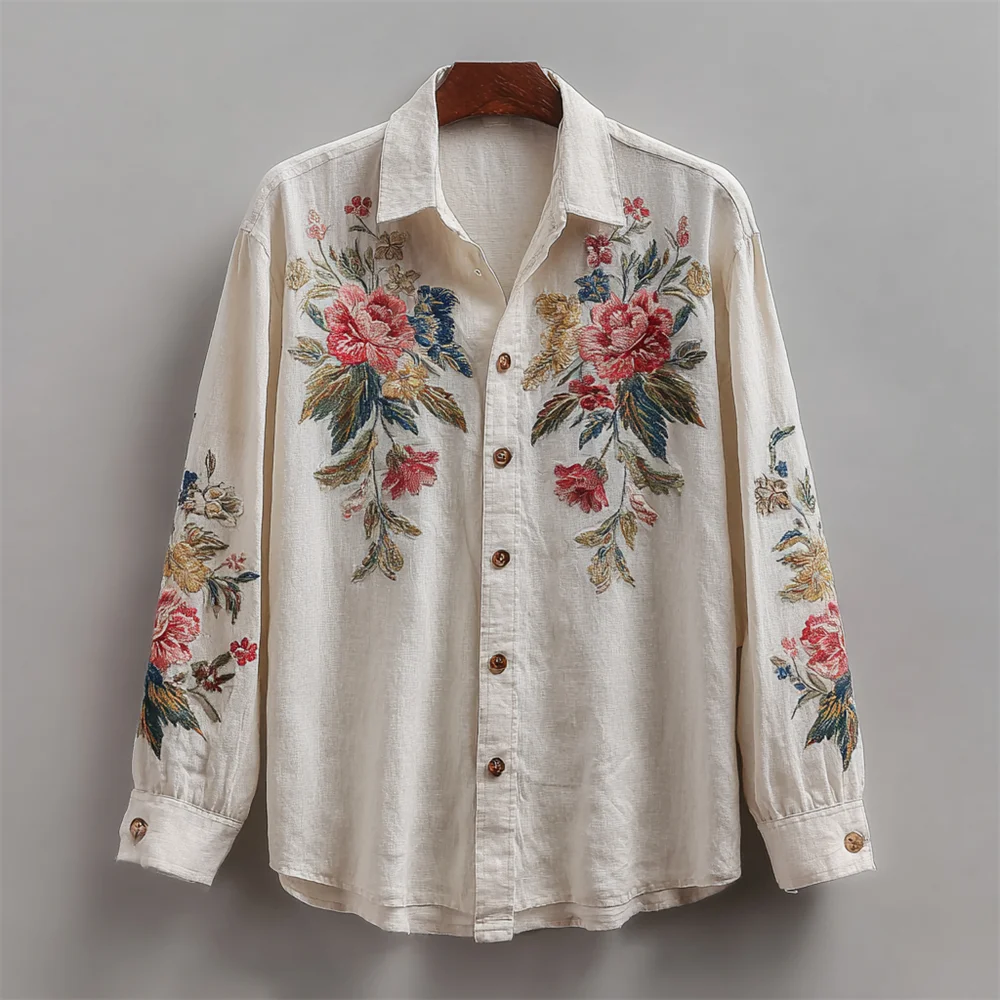 Vintage Boho Floral Embroidery Men's Linen Long Sleeve Shirt