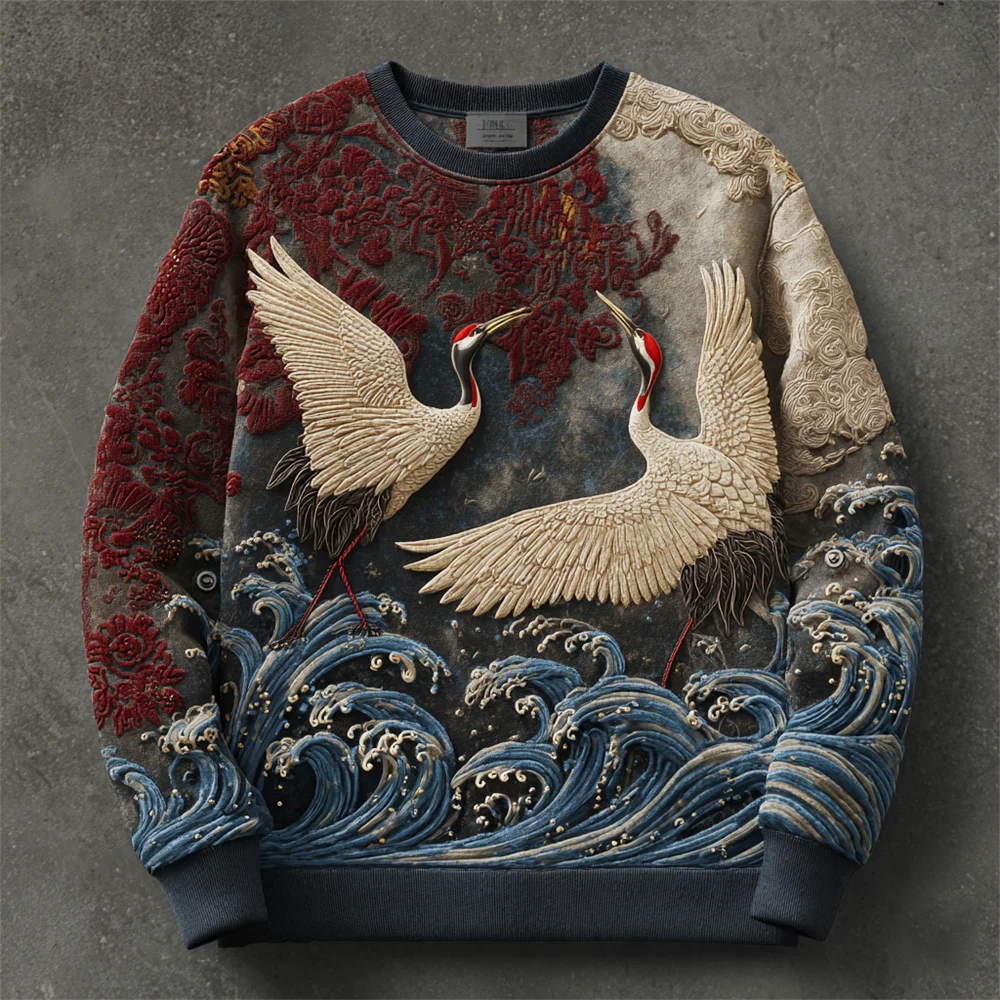 Vintage Japanese Ocean Crane Embossed Art Men's Casual Sweatshirt