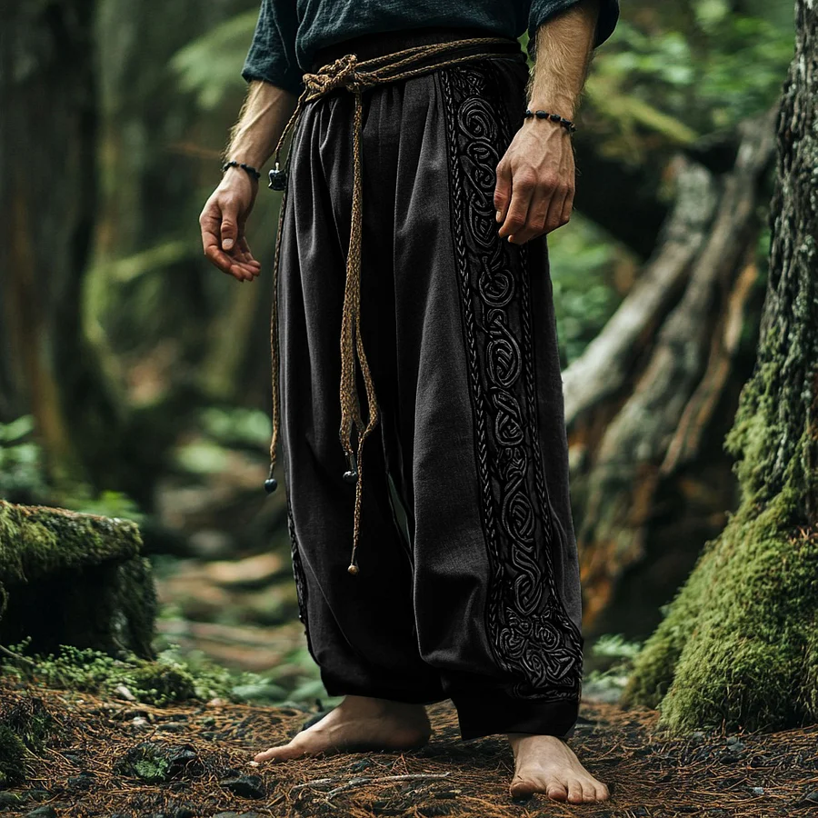 Vintage Tribal Viking Celtic Embroidery Art Linen Long Loose Wide-leg Pants