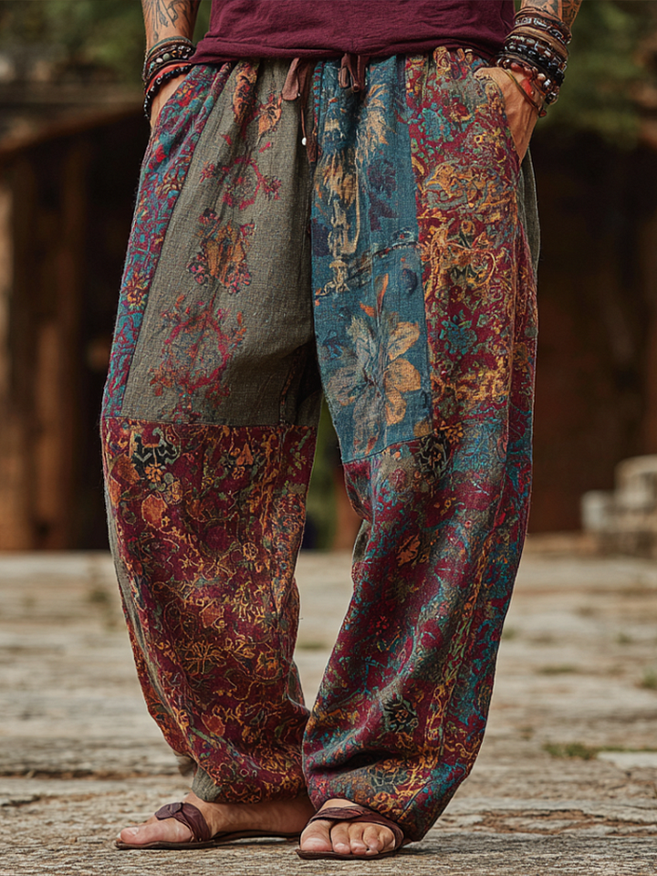 Western Bohemian Style Plant And Flower Pattern Retro Cotton And Linen Loose Wide-leg Pants